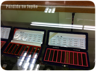 Detalhe: fazer um inkan sai caro! É como você estivesse pagando um artista para criar uma obra de arte! E eles cobram por letra. Como o meu sobrenome tem 6 letras em katakana saiu por 6.000 ienes! Takai né! Para se ter uma idéia, os sobrenomes japoneses mais comuns, como Minami, você encontra nas lojas de hyaku-en!