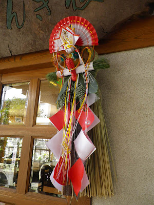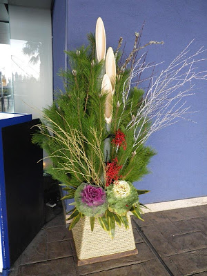 Feito a limpeza, colocam uma espécie de enfeite chamado kadomatsu na entrada. O kadomatsu é feito com ramos de pinheiro e bambu. Acredita-se que esse objeto espanta os maus espíritos além de servir como guia para o Deus do ano, levando prosperidade às residências. O pinheiro simboliza vida longa e o bambu força. Pelo que vi por aqui, os kadomatsu são mais comuns nas entradas de comércios. Nas casas, os japoneses costumam pendurar em suas portas um enfeite chamado shimekazari que possui o mesmo significado.