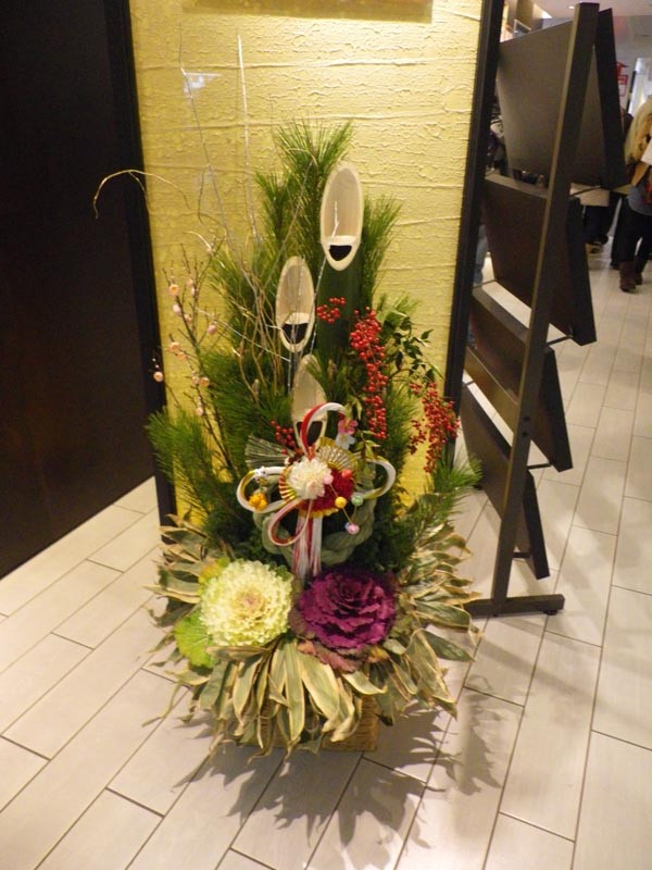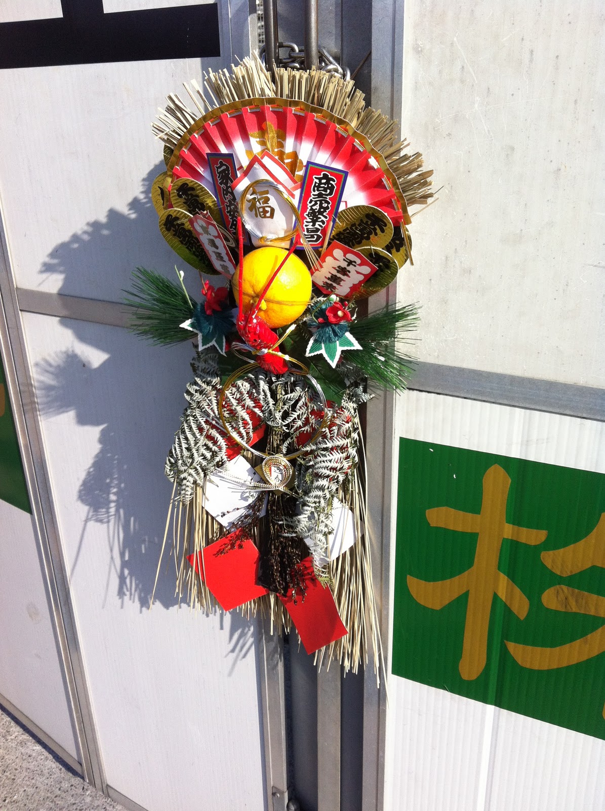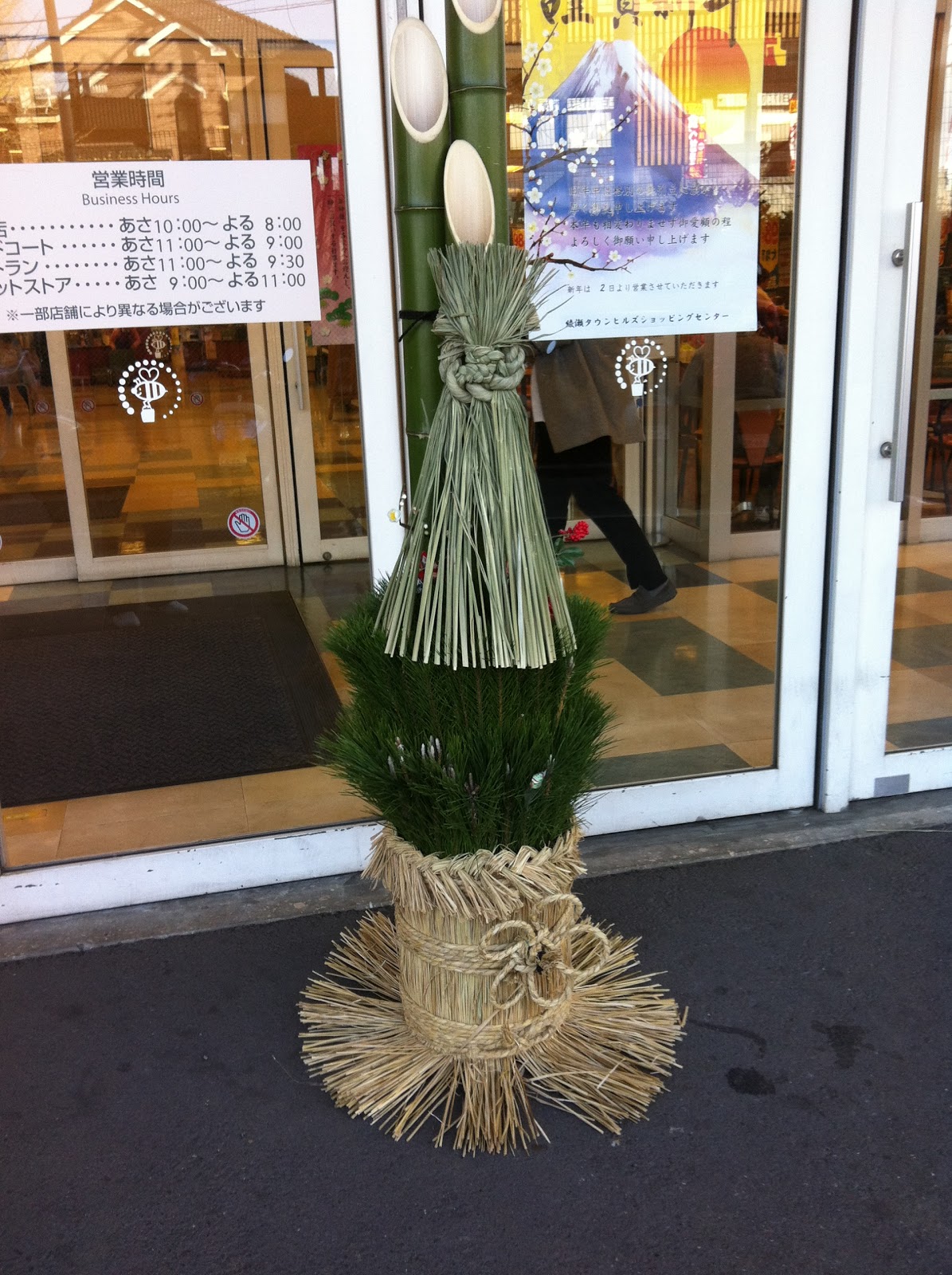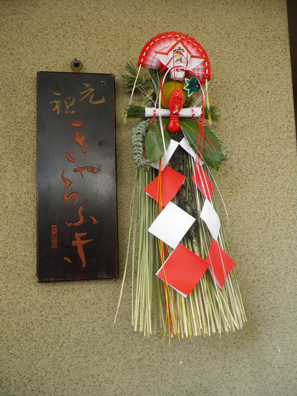 Feito a limpeza, colocam uma espécie de enfeite chamado kadomatsu na entrada. O kadomatsu é feito com ramos de pinheiro e bambu. Acredita-se que esse objeto espanta os maus espíritos além de servir como guia para o Deus do ano, levando prosperidade às residências. O pinheiro simboliza vida longa e o bambu força. Pelo que vi por aqui, os kadomatsu são mais comuns nas entradas de comércios. Nas casas, os japoneses costumam pendurar em suas portas um enfeite chamado shimekazari que possui o mesmo significado.